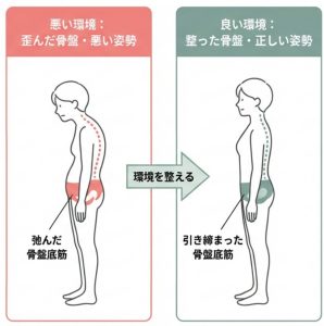 悪い姿勢は骨盤の傾きや捻じれといった「骨盤の歪み」を引き起こし、骨盤底筋のたわみや緩みを引き起こします。