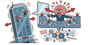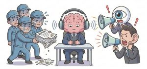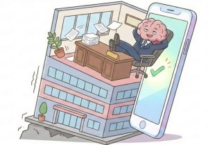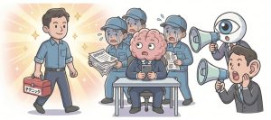 スマホ首によるめまいは、悪い姿勢のせいで疲弊した現場社員から送られてくる誤った報告を真に受けた社長が、誤情報を基に売り上げ目標を設定した事で、さらに現場が疲弊するという悪循環の結果生じた混乱です。