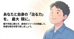 カイロプラクティックは、「スマホ首によるめまい」に対してリストラ(手術)や小手先の対処法(投薬)などの副作用が強い介入は行いません。代わりに、今ある社内リソース(患者自身の身体)を再編・有効活用することで、組織が自ら不調を直し、快適に動き続ける力を取り戻せるよう努めています。